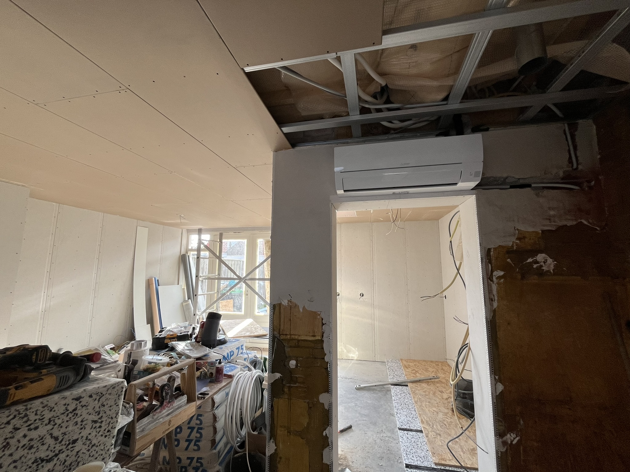 Eenmaal onder de vloer via het woonkamer plafond mee met de koelleidingen van de woonkamer airco.