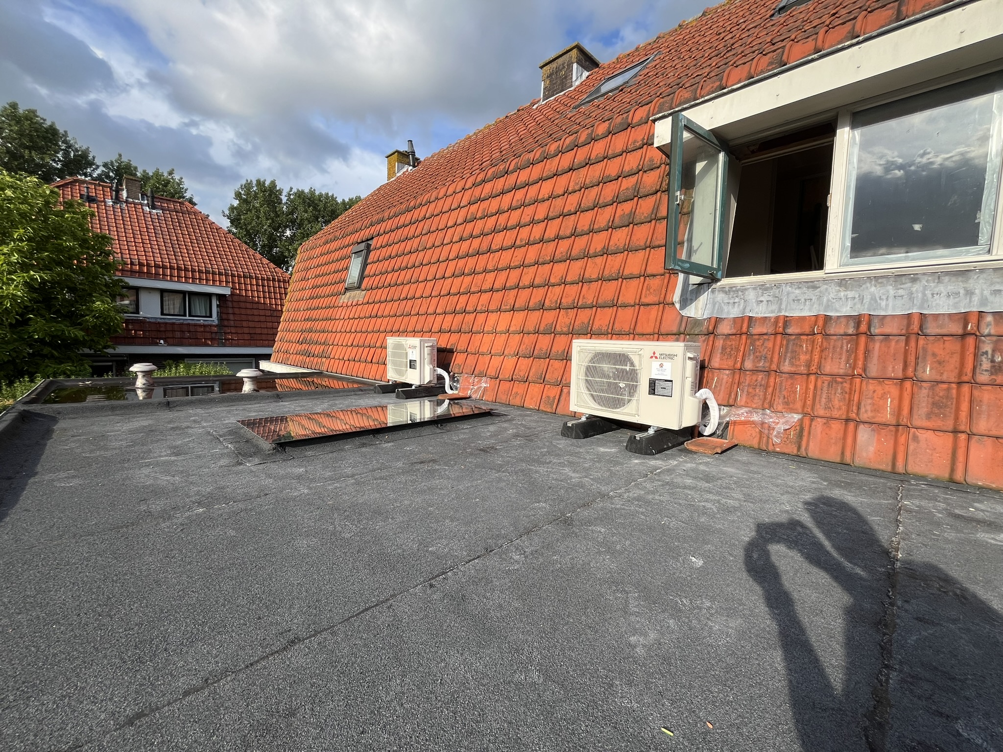De koelleidingen van de binnenunit van de woonkamer lopen door de muur en plafond naar boven en komen onder de dakpannen door naar buiten.